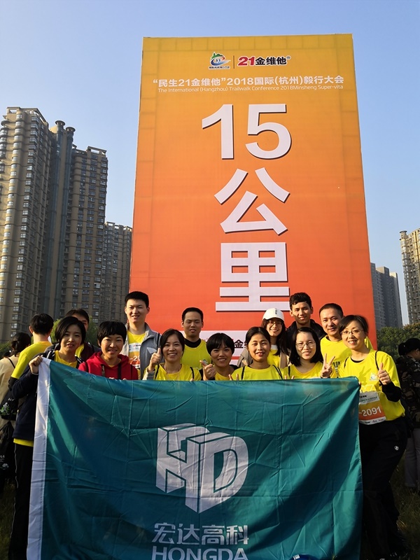 11月10日上,“民生21金維他”2018國際(杭州)毅行大會在杭州舉行,一萬五千名國內外毅行者齊聚漁人碼頭生態公園,燃情開走。宏達高科13名員工組成的代表隊參加15公里組。
