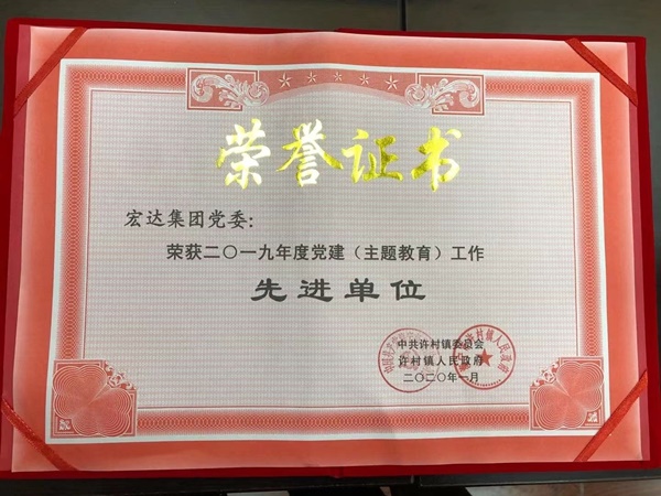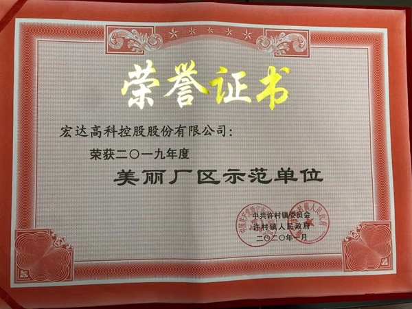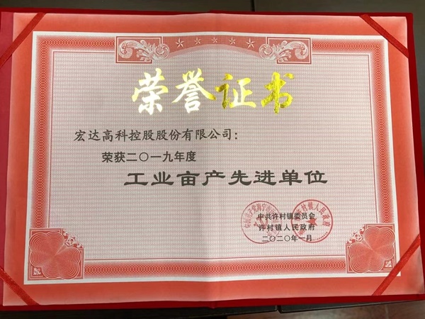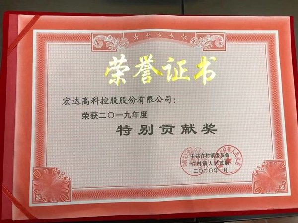 2020年1月22日下午,許村鎮召開2019年度總結表彰大會。鎮機關全體工作人員、村(社區)兩委班子成員、億元以上企業、駐鎮單位負責人參加。宏達高科控股股份有限公司被評為年度工業畝產先進單位、美麗廠區示范單位、特別貢獻獎、黨建(主題教育)工作先進單位。